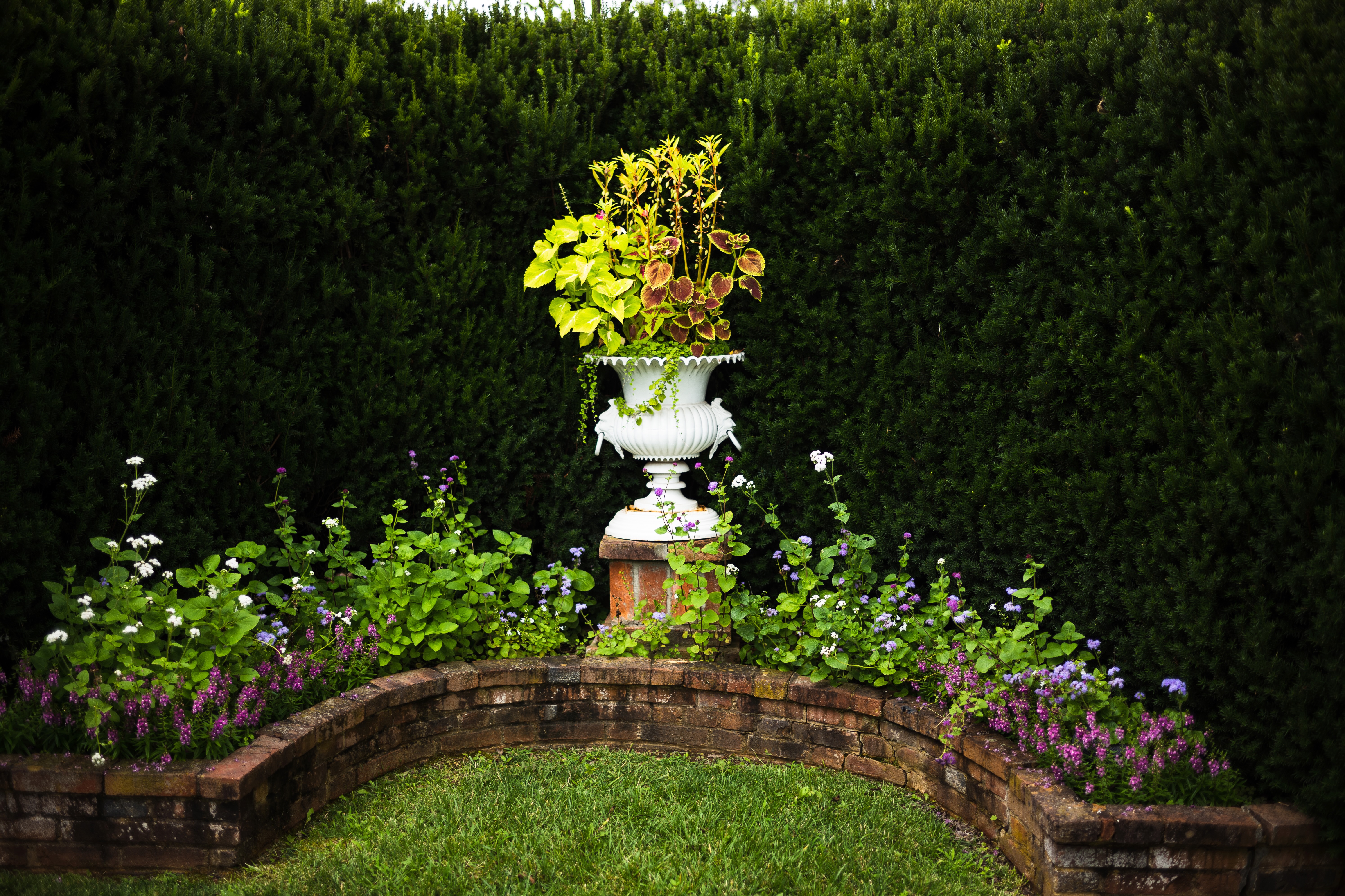 A pristine white urn brimming with verdant foliage stands elegantly at the center of a curving brick border, surrounded by vibrant blossoms. The lush green hedges loom protectively in the background, casting a tranquil ambiance over the scene. Soft, diffused light illuminates the colors, enhancing the serene, inviting mood of this garden oasis.
