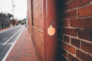 In this photograph, a quirky, cartoonish sticker resembling a lightbulb clings to a weathered brown pipe against a backdrop of textured red bricks. The composition creates an intriguing contrast between the playful subject and the stark urban environment, while the diffused daylight enhances the understated mood. The scene invites a sense of curiosity, inspiring viewers to pause and appreciate the little details hidden in familiar spaces.