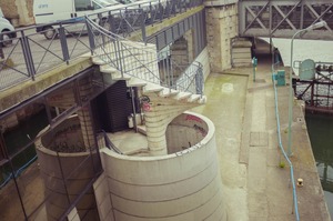 This photograph captures a unique urban landscape featuring a round concrete structure juxtaposed against modern architecture. The soft, diffused lighting enhances the muted colors, evoking a sense of solitude and intrigue. The presence of graffiti adds an element of rawness, while the winding staircase invites exploration of this forgotten space by the water.