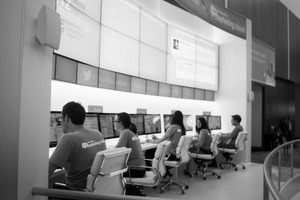 The photograph captures a sleek, modern workspace where a team of individuals sits in a row, absorbed in their computer screens. The monochrome palette adds a sense of seriousness and focus, while the clean lines of the setting enhance the collaborative mood. Bright screens illuminate their faces, contrasting with the soft ambient lighting of the space, emphasizing a blend of concentration and technology-driven teamwork.