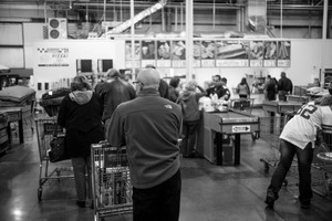 In a bustling warehouse store, shoppers form a line as they await checkout, the scene buzzing with anticipation yet hinting at impatience. The monochrome palette accentuates the somber mood, capturing a moment of waiting and reflection amidst the shopper's hustle. Strong lighting falls from above, casting long shadows that blend with the industrial surroundings, creating a sense of anonymity and shared experience.