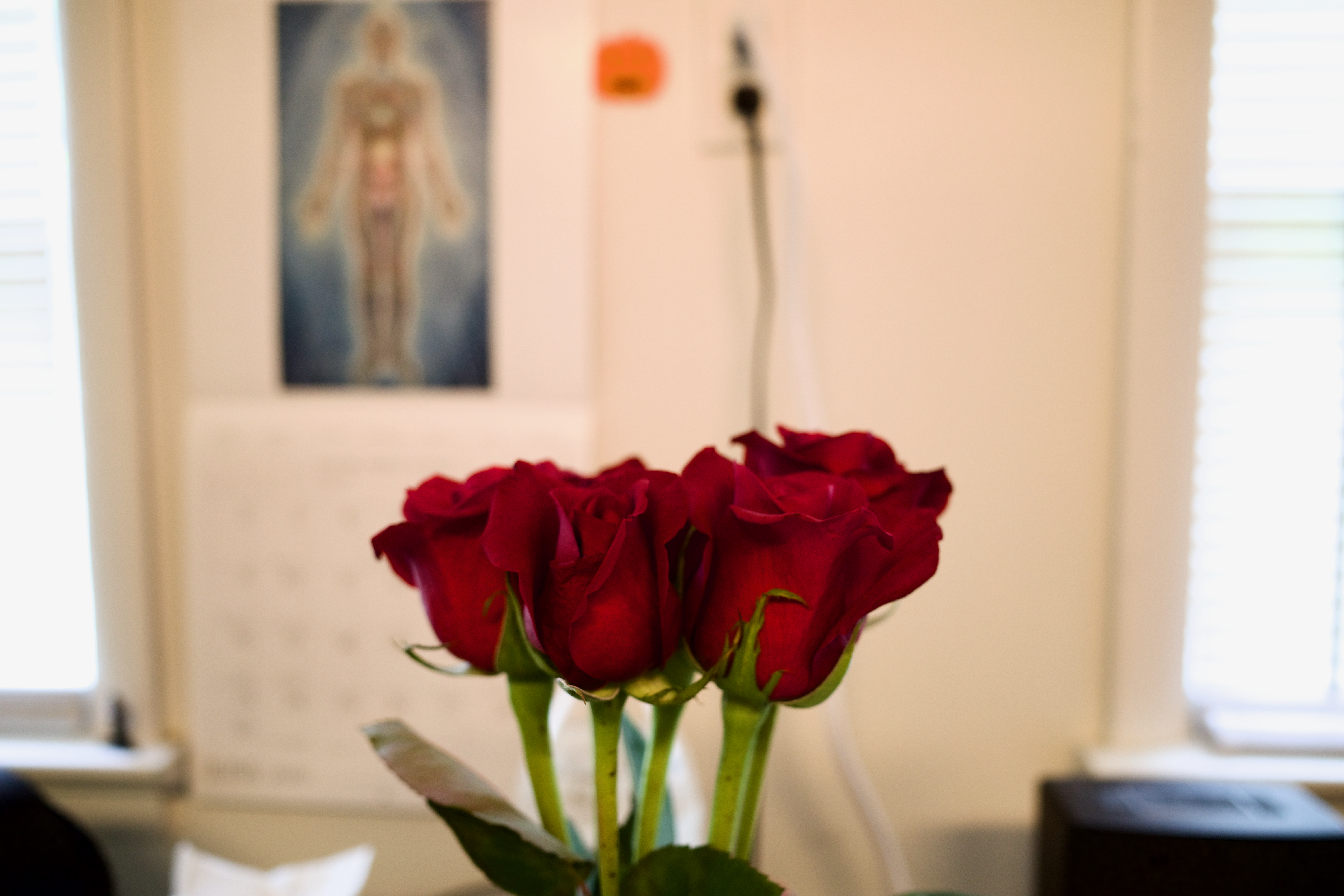 In this intimate still life, a bouquet of deep red roses captures attention against a softly blurred background. The gentle lighting enhances the rich hues of the petals while hints of the room's decor provide a warm, inviting atmosphere. The composition draws the eye to the roses, suggesting romance and tenderness amidst the everyday setting.