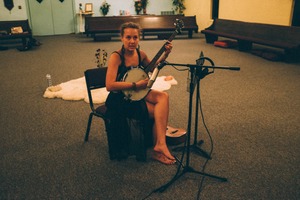 A young woman sits on a stool in a sparse, softly lit room, strumming a banjo with an expression that blends concentration and vulnerability. The warm glow of light creates an intimate atmosphere, highlighting her bare feet and casual attire, while a plush white rug and muted furnishings evoke a sense of simplicity and nostalgia. The composition draws the viewer in, capturing a moment of solitude and artistic expression amidst the quiet surroundings.
