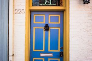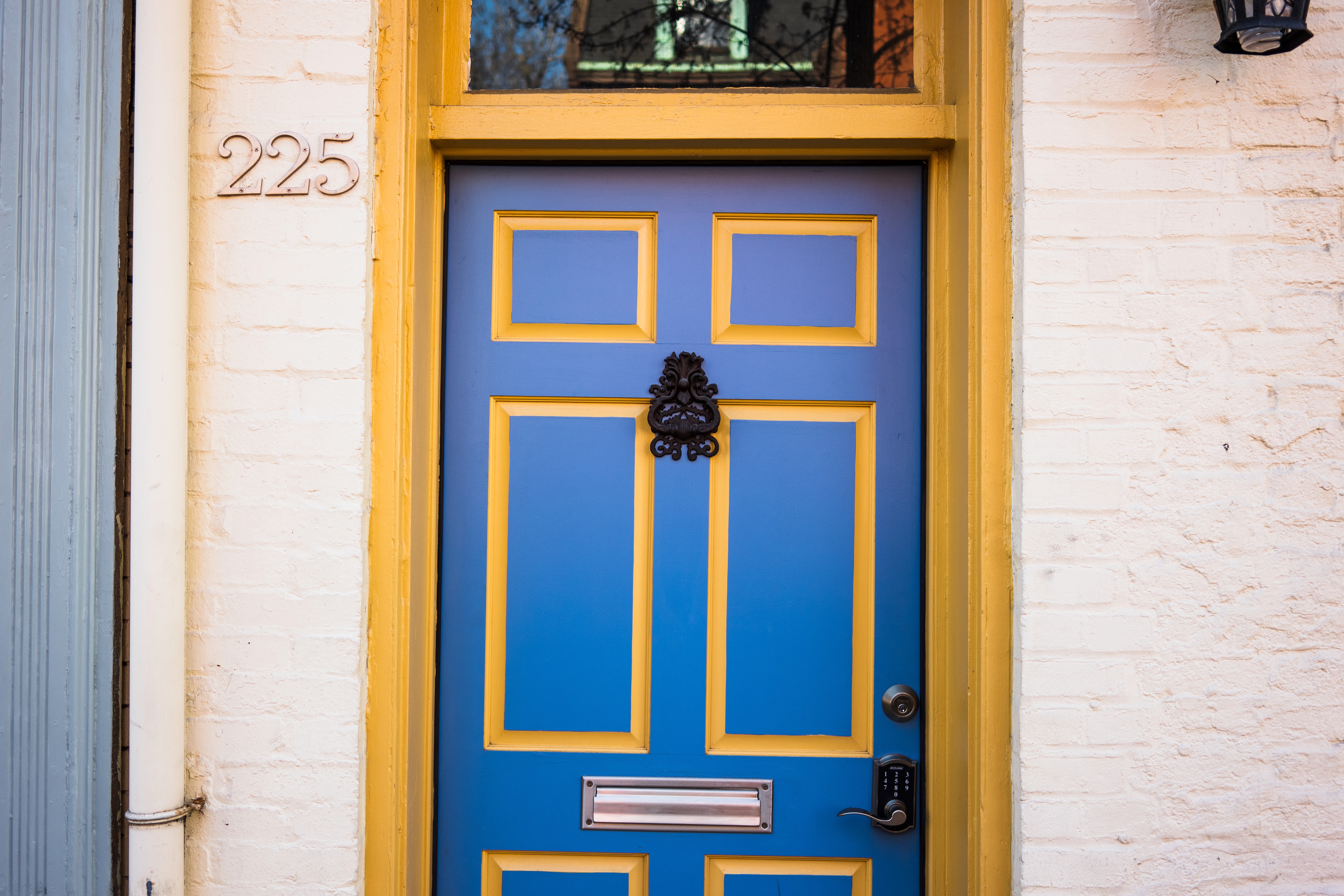 The photograph captures a vibrant blue door framed with cheerful yellow accents, evoking a sense of warmth and welcoming. The detailed doorknob adds a touch of elegance, while the subtle light reflects off the door, enriching its colors and textures. The tidy, minimalistic composition highlights the distinctive features of the door, inviting intrigue about what lies beyond it.