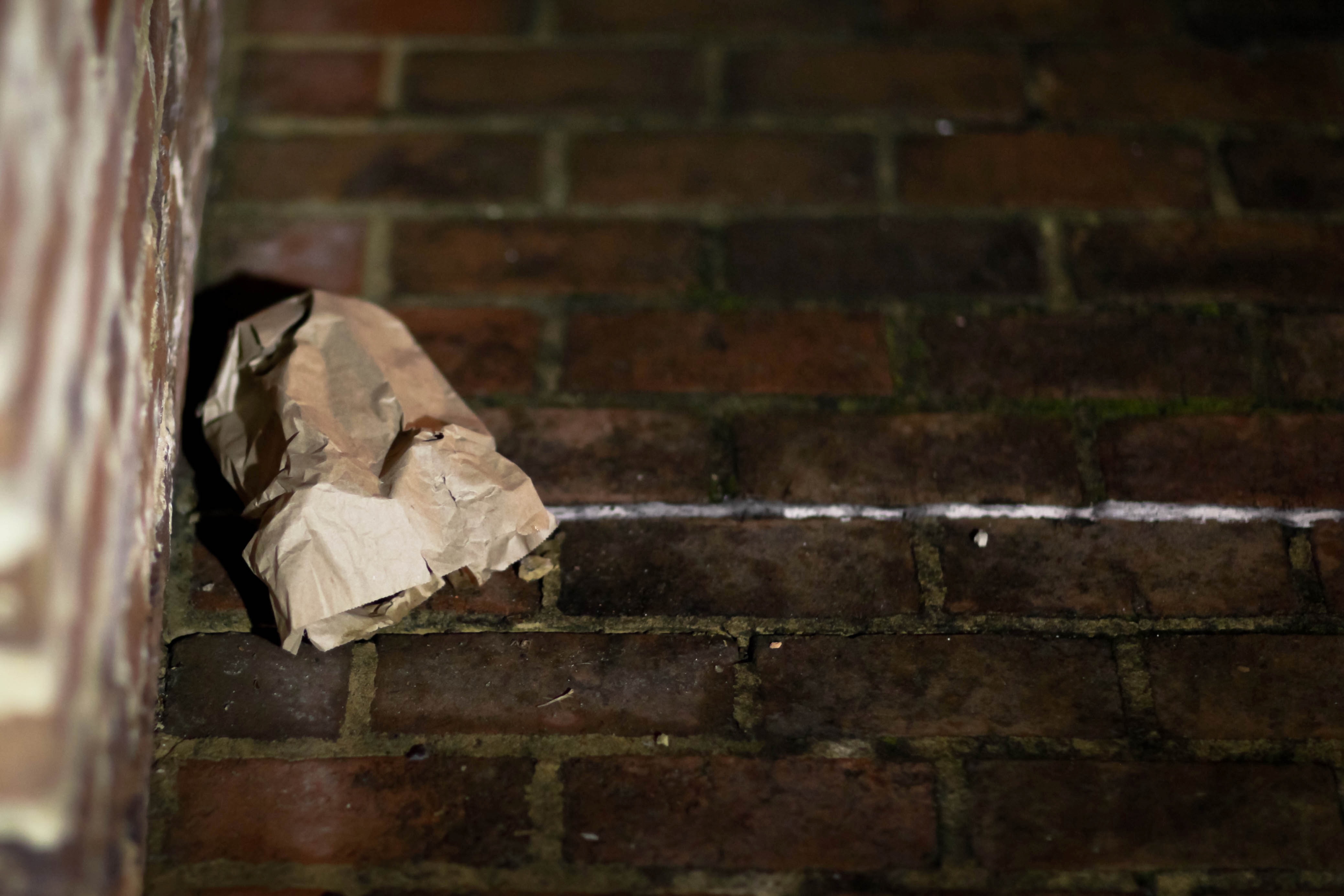 A crumpled piece of brown paper rests against a weathered brick wall, accentuating the mood of neglect and abandonment. The low light creates stark shadows, emphasizing the texture of the bricks and the paper's creases, while a subtle sheen of moisture hints at the passage of time. This composition invites contemplation on what stories and moments might have led to this quiet, solitary scene.