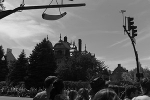 In this black-and-white photograph, a crowd gathers in anticipation, their silhouettes framing an ornate historical building in the background. The contrast of the rich textures of the architecture against the muted tones evokes a sense of nostalgia, while the distant trees add depth to the composition. The lighting suggests a bright day, enhancing the atmosphere of expectation and curiosity among the spectators.