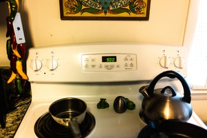 This photograph captures a cozy kitchen scene centered around a clean white stove, its digital clock reading 9:00. The warm light filtering through the window bathes the chrome kettle and glossy pots in a soft glow, while whimsical decorations like colorful chili peppers and playful frog figurines add a touch of charm, creating a sense of warmth and familiarity in the domestic space.