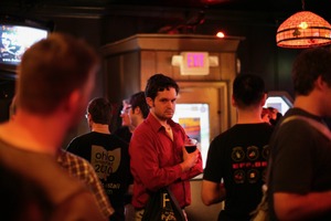 In a dimly lit bar, a lone figure stands out with a contemplative expression, clutching a drink as others chat animatedly around him. The warm glow of the lamps casts a soft light over the scene, creating a contrast between the vibrant social atmosphere and his introspective demeanor. The composition balances the chaotic energy of the crowd with the subject's solitude, inviting viewers to ponder their story.