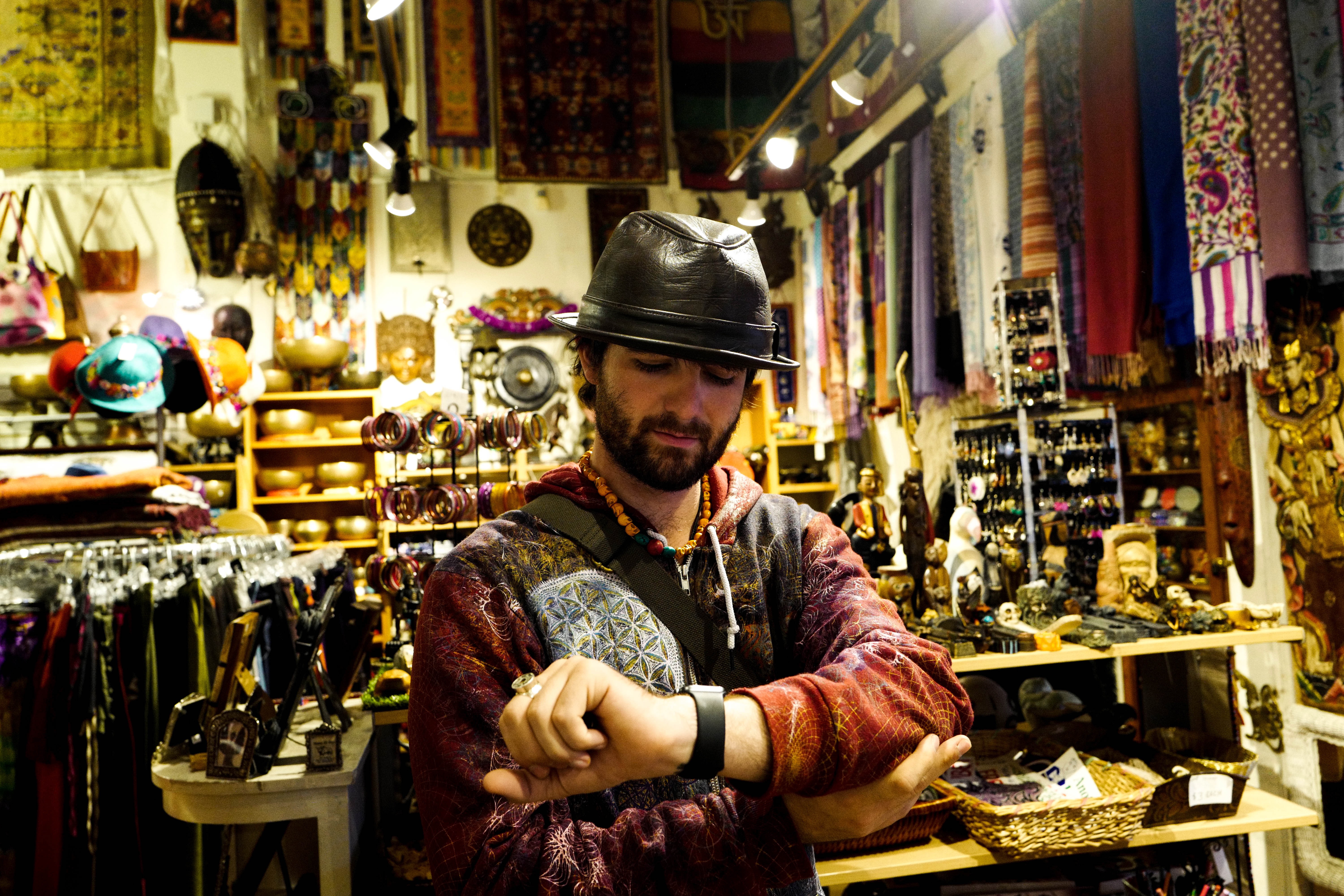 In a vibrant, eclectic shop filled with textiles and woven treasures, a young man gazes thoughtfully at his wristwatch. The warm lighting envelops him in a cozy ambiance, highlighting his stylish hat and colorful attire, while intricate patterns and crafts of the shop create a rich, cultural backdrop. The image captures a sense of introspection amidst a bustling marketplace atmosphere.