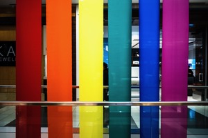 This photograph showcases a striking arrangement of colorful fabric strips, vertically aligned and glowing with vivid hues of red, orange, yellow, green, blue, and purple. The reflections on the polished floor enhance the sense of depth, while the ambient lighting infuses the scene with a joyful, celebratory mood. The composition invites the viewer's eye to traverse the spectrum, evoking feelings of creativity and happiness.