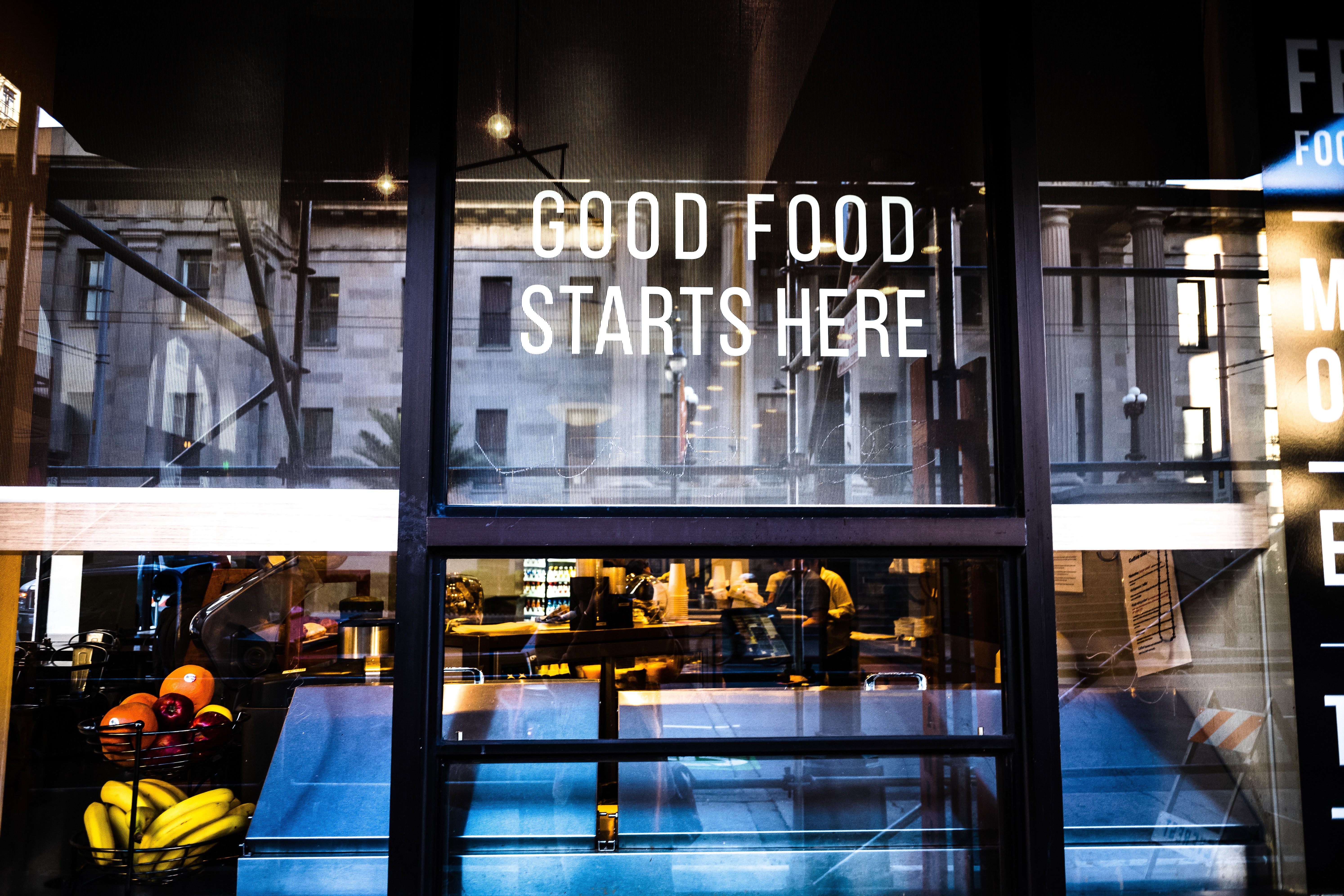 This photograph captures a welcoming eatery with the bold sign 'GOOD FOOD STARTS HERE' prominently displayed in the window. The composition draws the eye through the glass, revealing a glimpse of the bustling interior complemented by warm, inviting lighting. Bright fruits in a basket foreground the scene, enhancing the atmosphere of nourishment and community.