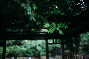 The photograph captures a serene moment beneath a canopy of lush leaves, creating an intimate connection with nature. Soft, dappled lighting filters through the foliage, casting a calming ambiance that envelops the scene. The blurred background enhances the sharpness of the leaves, drawing the viewer’s eye to the delicate details of life thriving in the shadows.