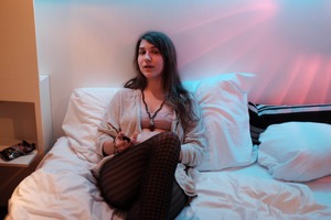 In a softly lit bedroom, the subject sits casually on a unmade bed, draped in a cozy cardigan and patterned tights. The play of cool blue and warm hues creates a dreamy atmosphere, enhancing the intimate yet relaxed mood of the scene. With a contemplative expression, she seems to invite the viewer into a personal moment, framed by the simplicity of her surroundings.