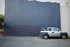 A solitary silver car parks by a large, faded blue wall, emphasizing the emptiness of the scene. The stark contrast between the vehicle and the textured wall creates a sense of quiet contemplation. Soft, diffused lighting enhances the muted colors, contributing to an overall serene yet melancholic mood.