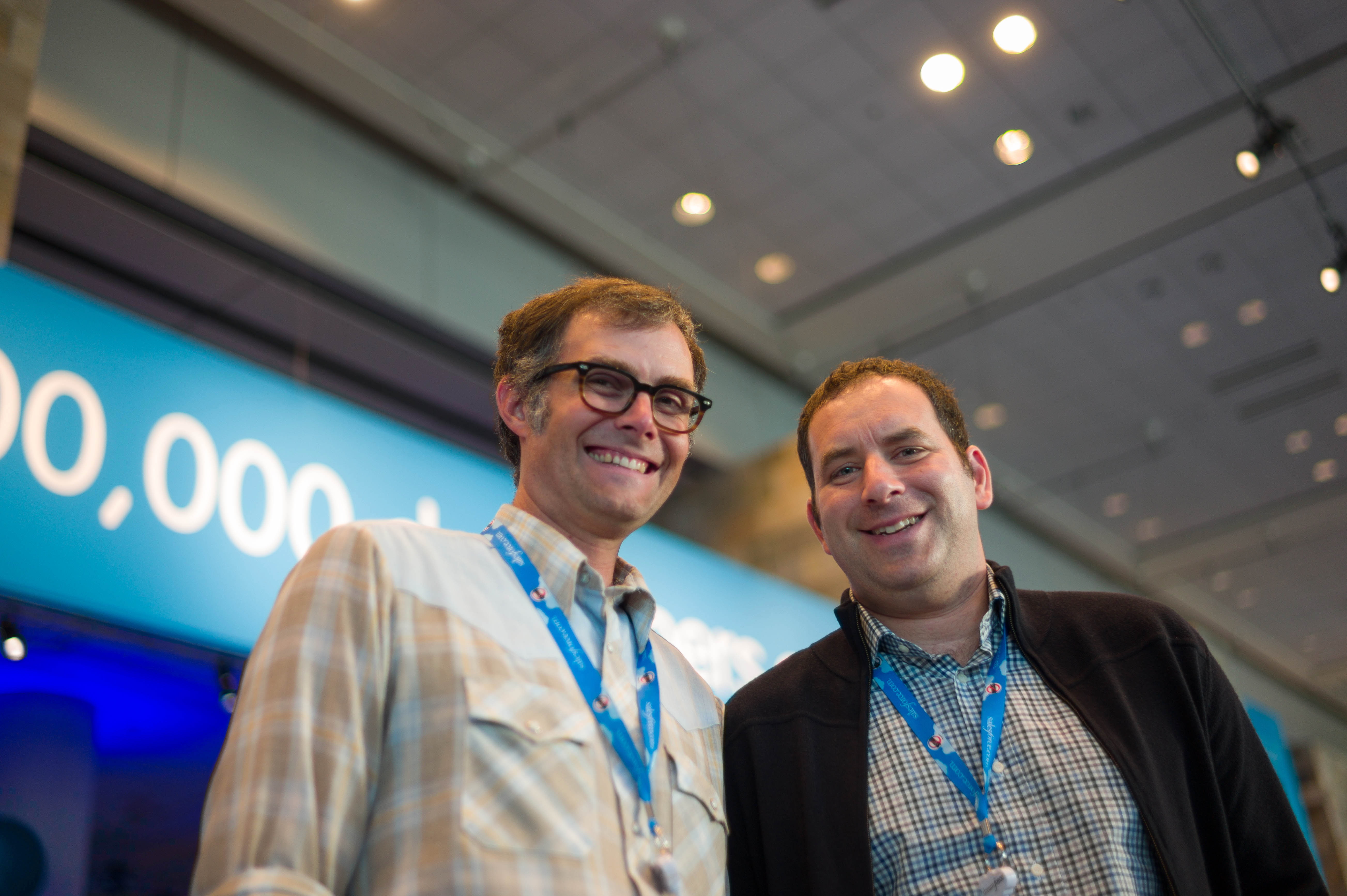Two men, wearing casual outfits and lanyards, stand cheerfully under a large sign. The composition captures their smiling faces against a softly lit backdrop, creating an inviting and friendly atmosphere.