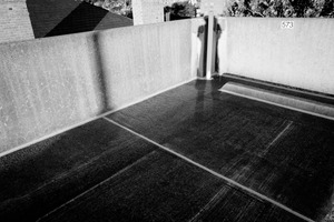 The photograph captures a stark rooftop scene, dominated by concrete textures and sharp shadows. The monochrome palette enhances the sense of isolation while the composition draws the eye across the empty space, evoking a feeling of quietude and contemplation. A solitary number on the wall adds a subtle sense of identity amidst the minimalism.