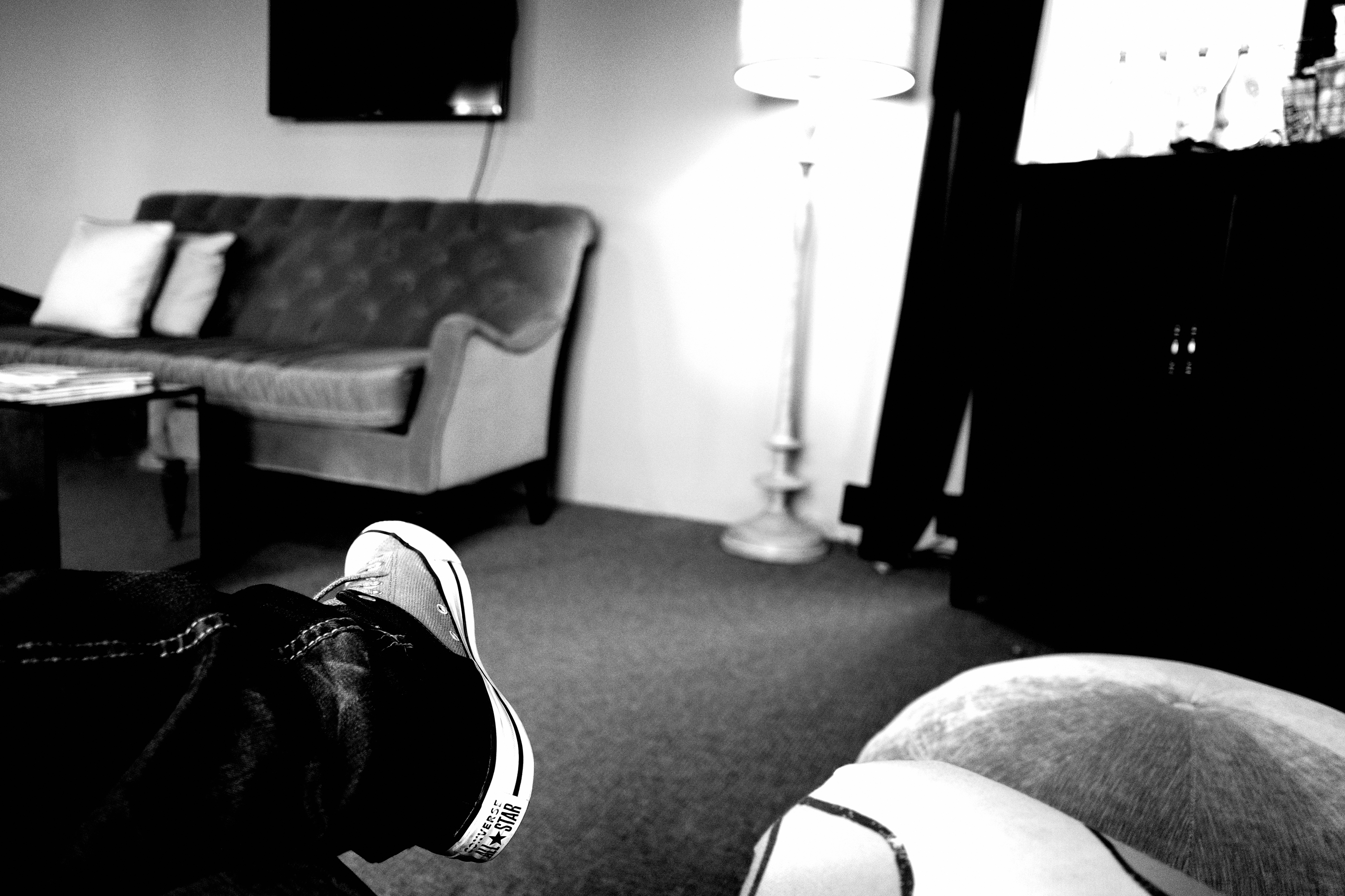 This photograph captures a relaxed moment, focused on a foot encased in a sneaker, offering a sense of casual elegance. The room's muted tones and soft lighting create an inviting atmosphere, while the contrasting black and white further enhances the mood of tranquility and introspection. The composition leads the eye through the cozy space, suggesting comfort and repose amidst a stylish environment.