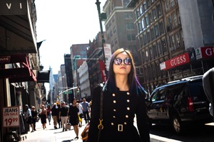 In a bustling city street bathed in bright sunlight, a young woman strides purposefully, exuding confidence with her dark attire and striking sunglasses. The composition captures her amidst a crowd, with blurred figures and vibrant storefronts that emphasize the dynamic energy of urban life. The interplay of light and shadow enhances the mood, creating a vibrant yet focused atmosphere.