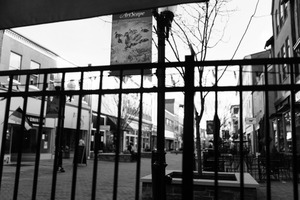 This black-and-white photograph captures a quiet street scene, framed by an ornate iron fence that adds a sense of separation. The low light casts soft shadows, emphasizing the stillness of the deserted storefronts and the bare branches of trees, infusing the space with a contemplative mood. The distant lamp posts, coupled with the banner evoking an artsy theme, hint at life and vibrancy just beyond the confines of the fence.