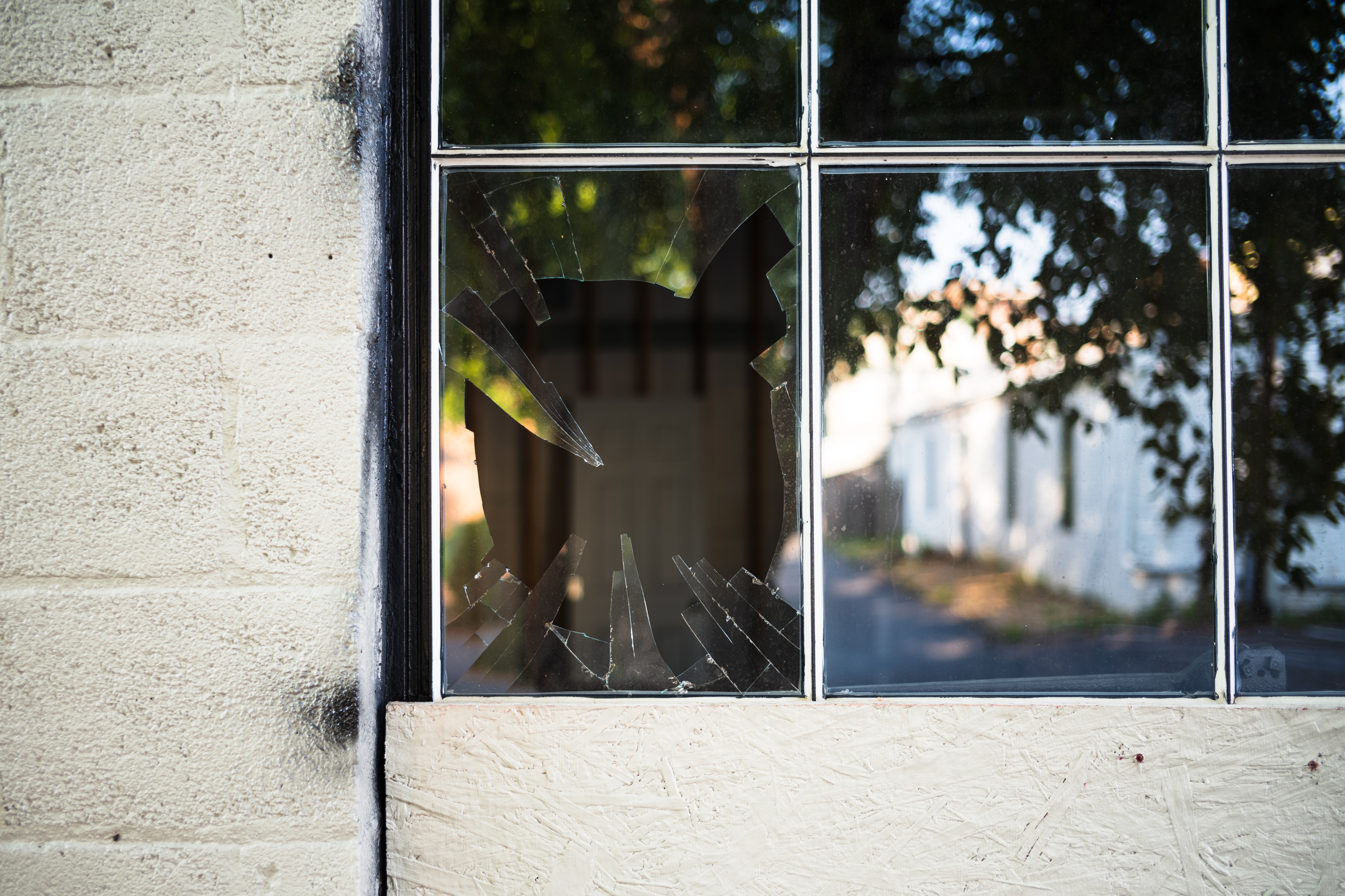 The photograph captures a broken window pane, shards of glass jutting out from the frame like jagged teeth. Outside, a blurred view of a serene street contrasts starkly with the chaos of the shattered glass, suggesting a sense of lost beauty and tranquility. The warm, diffused light filters through, creating an eerie yet poetic atmosphere that invites contemplation.