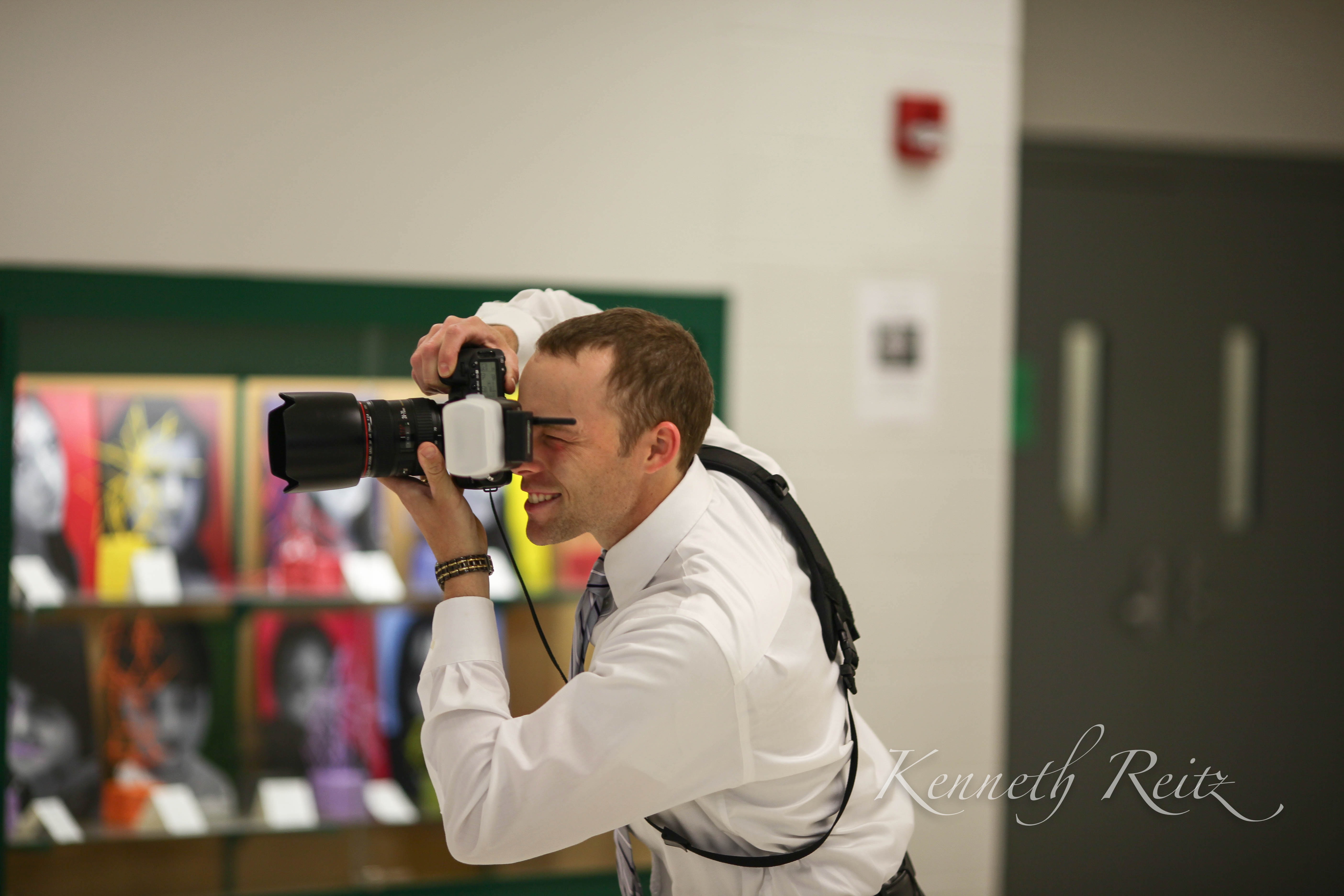 In a bustling gallery, a man dressed in formal attire is deeply engaged in the act of photography, exuding passion and focus. His smile indicates a sense of joy and immersion as he captures the vibrant artworks behind him, illuminated by soft, ambient light that highlights the event's lively atmosphere. The composition juxtaposes the dynamic photographer against the colorful portraits, emphasizing a connection between creation and capture.