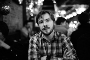 This intimate photograph captures a young man sitting confidently at a bustling bar, illuminated by warm, ambient lighting that contrasts with the monochrome tones. He gazes directly at the camera, with a composed expression that hints at contemplation amidst the lively atmosphere around him. The blurred figures in the background create a sense of movement and social chatter, enhancing the overall mood of camaraderie and quiet reflection.
