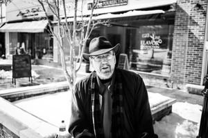 In a stark black-and-white scene, an older man sits outdoors, exuding a sense of quiet contemplation. Dressed in a dark coat and hat, his expressive face is illuminated by soft, natural light, capturing the character of a chilly day. The surrounding urban backdrop, dotted with snow, accentuates a mood of introspection amidst a bustling environment.