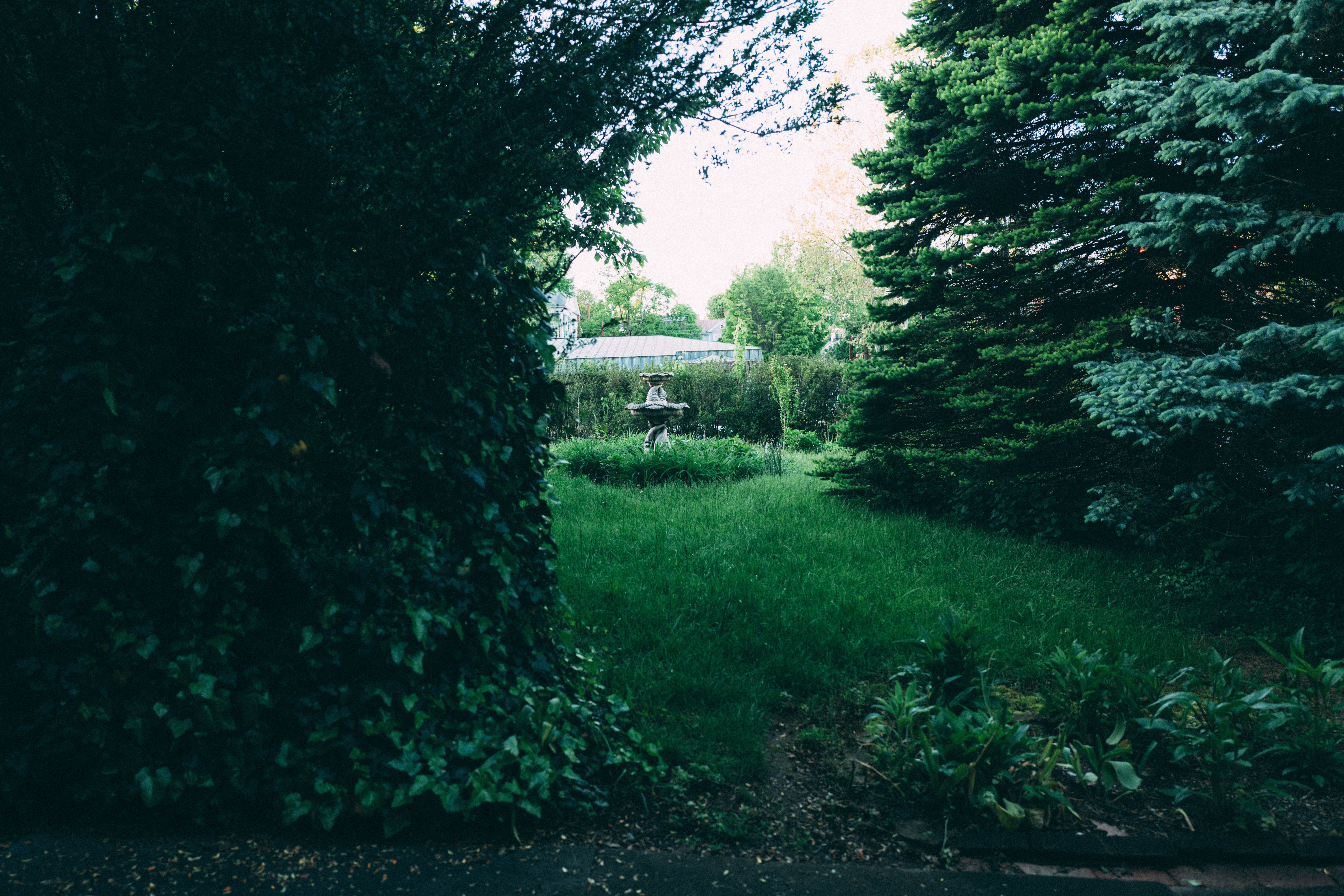 Framed by lush greenery, this photograph captures a tranquil garden scene centered around a solitary fountain. The soft morning light filters through, creating a peaceful atmosphere that invites reflection and stillness. The composition leads the eye down a pathway of verdant foliage, enhancing the sense of an enchanting escape.