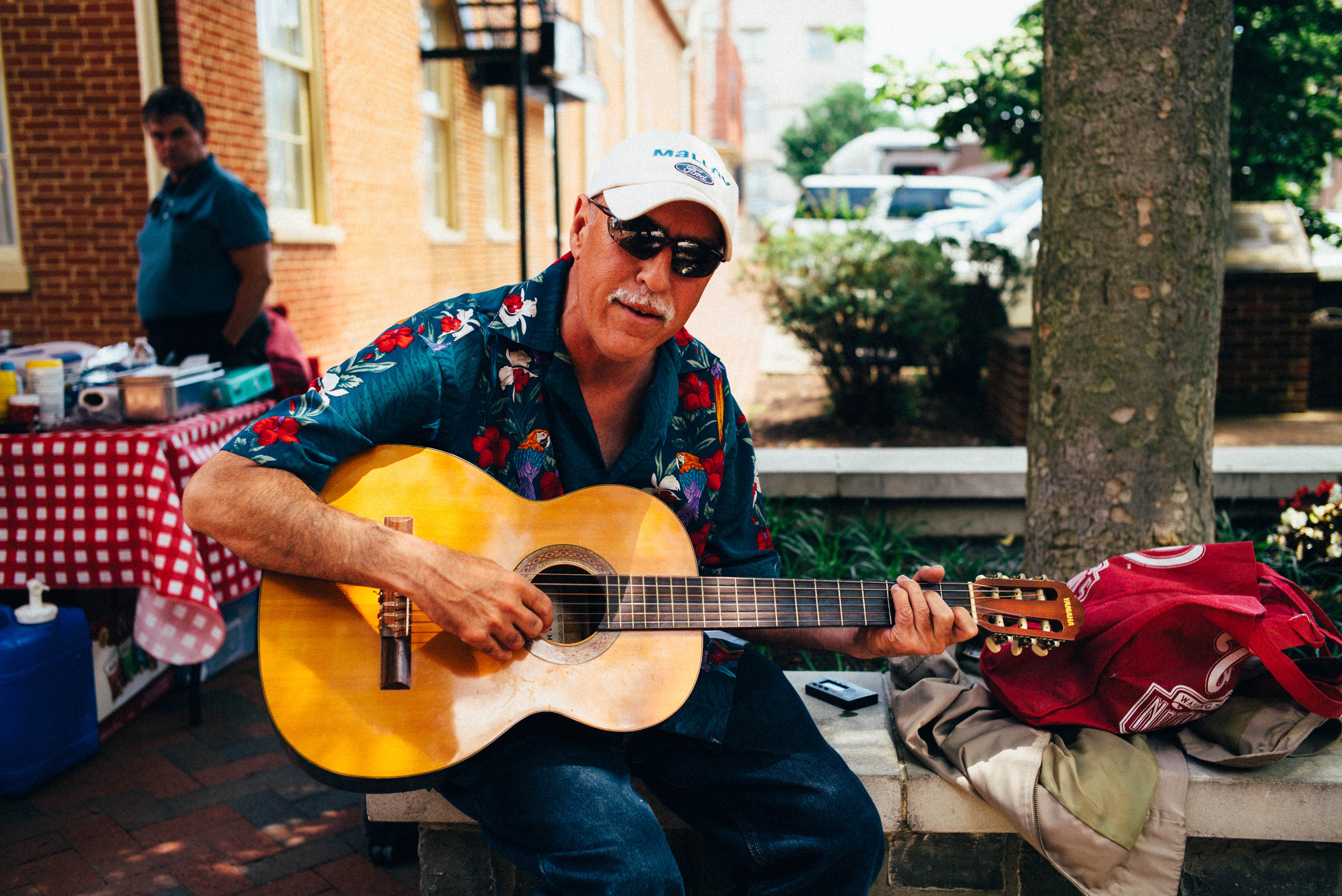 In a lively outdoor setting, a man in a vibrant floral shirt strums his guitar, exuding a relaxed and joyful vibe. The warm sunlight casts a gentle glow, enhancing the intimacy of the scene as he engages with his music, while a hint of curiosity from a bystander adds a layer of community interaction. The composition juxtaposes the musician against a backdrop of greenery and brick, creating a harmonious atmosphere of leisure and artistry.