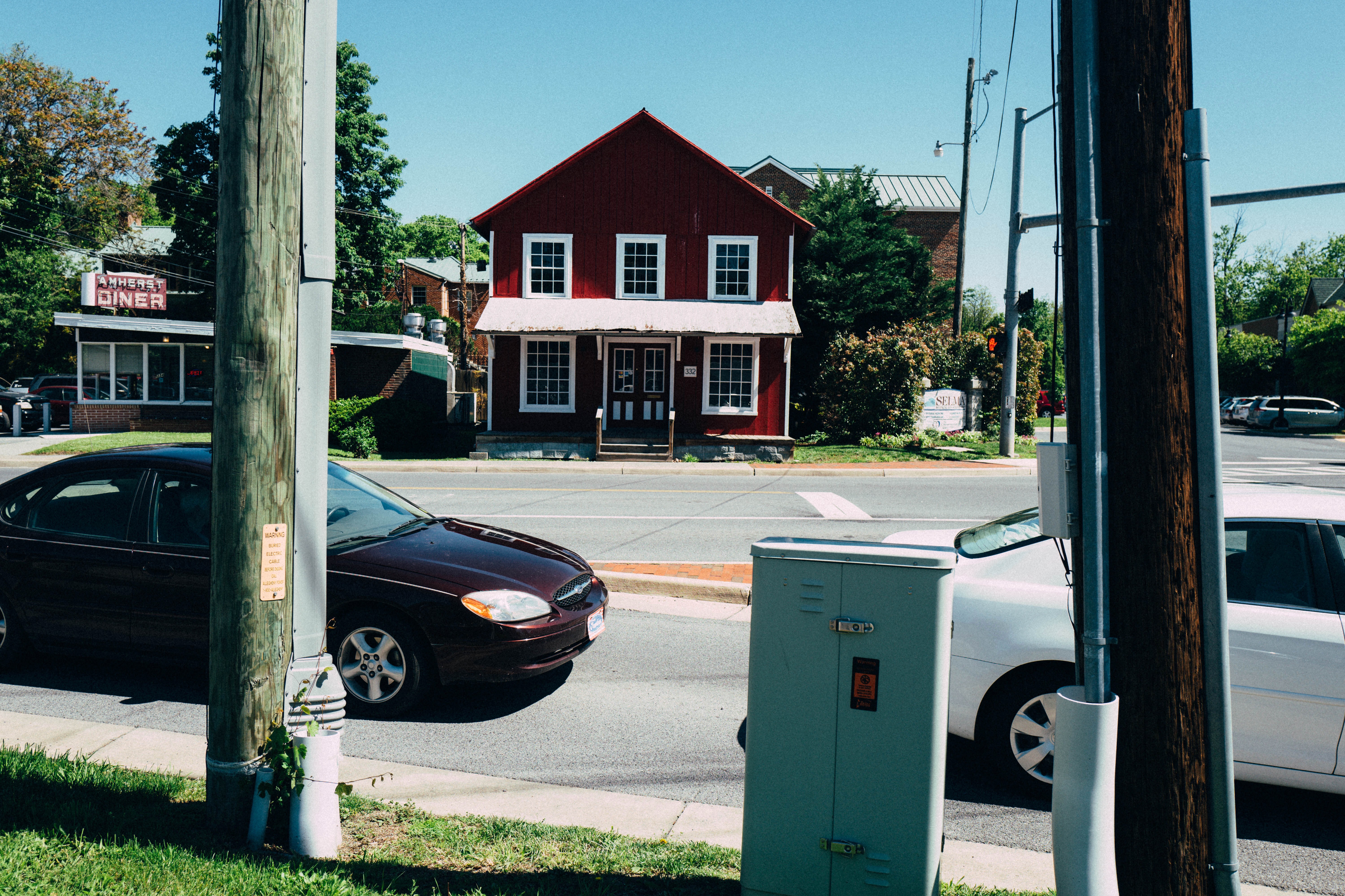 This photograph captures a vibrant red house facing a busy road, juxtaposed with a classic diner in the background. The bright blue sky enhances the scene, creating a cheerful and nostalgic atmosphere. The composition leads the viewer's eye from the foreground cars to the inviting structure, showcasing the charm of small-town life.