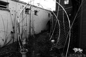The photograph captures a narrow, overgrown pathway framed by a stark white arch, hinting at a forgotten garden. The monochrome tones amplify the eerie mood, while shadows elongate, drawing the viewer’s eye towards a solitary figure, barely visible at the end of the path. Nature's reclaiming presence over the manmade elements suggests a haunting tranquility, inviting contemplation of time and isolation.