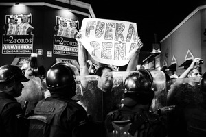 In a charged atmosphere, a man boldly brandishes a sign reading 'Fuera Peña,' demanding change amidst a backdrop of tension. The stark black-and-white composition highlights the faces of the police in riot gear, contrasting with the fervent passion of the crowd, evoking a mood of resistance and urgency. Dim streetlights cast shadows and create a dramatic interplay of light and dark, enhancing the sense of conflict.