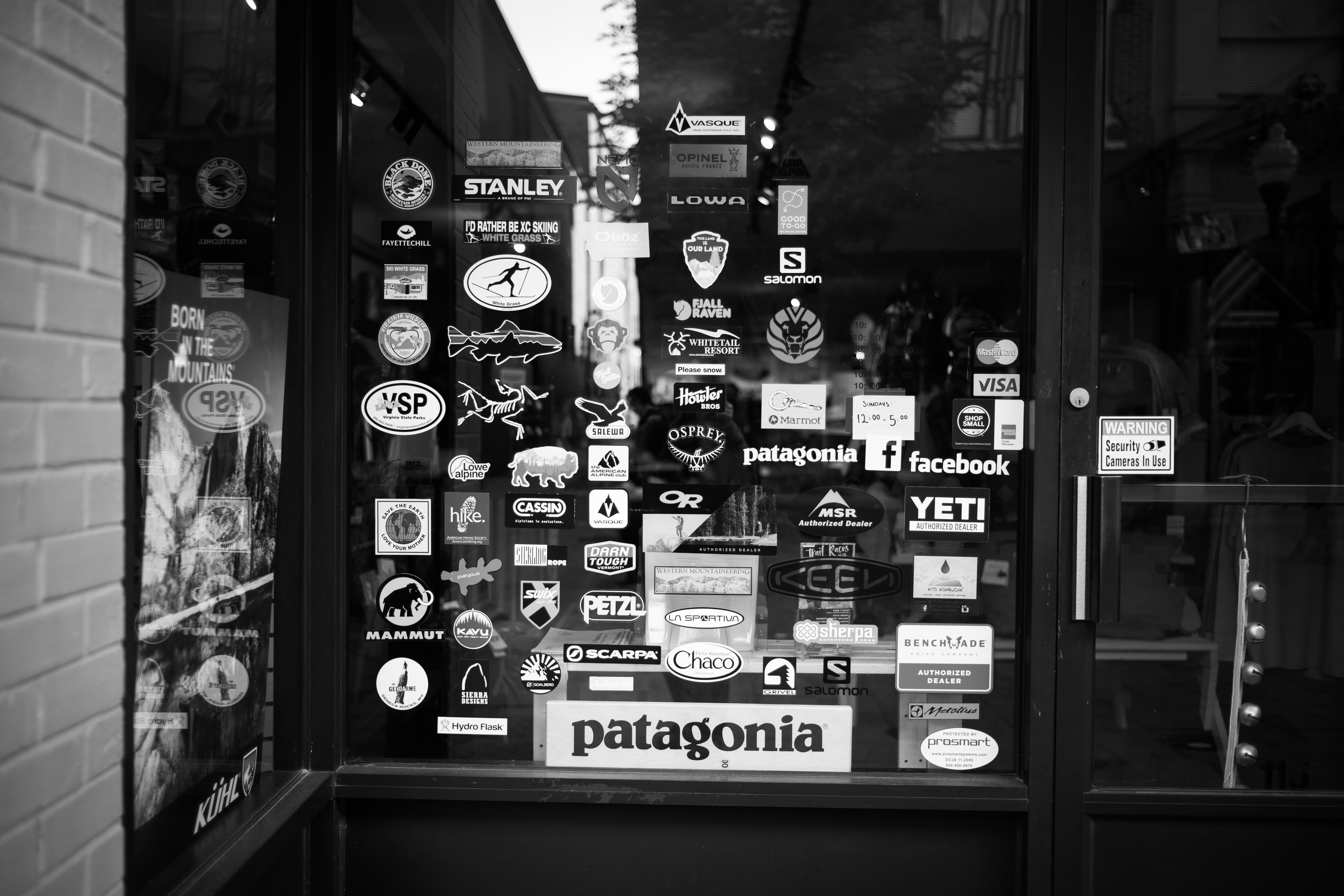 This photograph captures a storefront window adorned with a myriad of colorful outdoor brand stickers, prominently featuring Patagonia. The monochrome treatment enhances the texture and depth of the various logos, evoking a sense of nostalgia and adventure. Soft reflections in the glass suggest a bustling street outside, adding life to the display and inviting curiosity about the outdoor gear within.