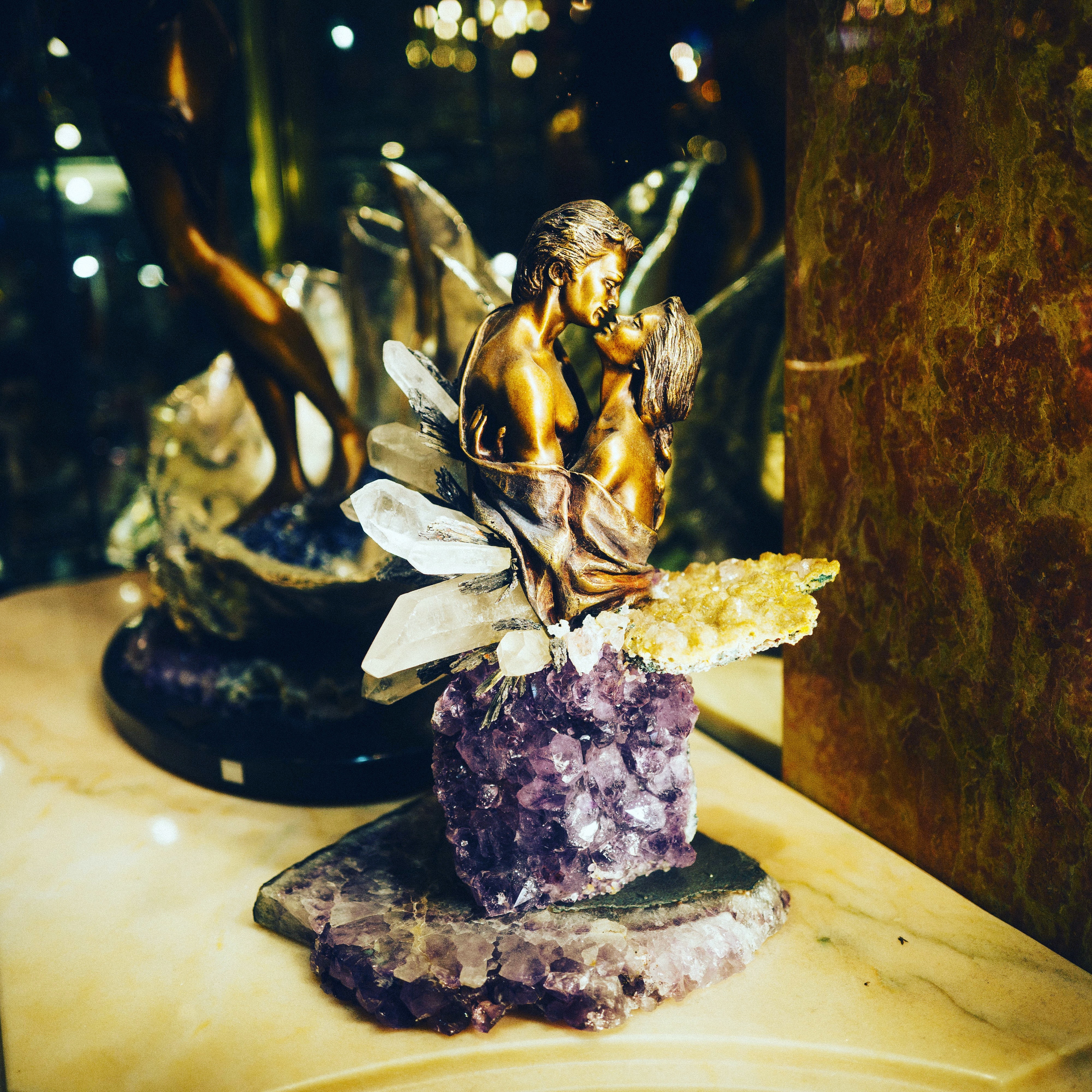The photograph captures a beautifully detailed sculpture of a couple locked in an intimate kiss, framed against a backdrop of shimmering crystals. Soft, warm lighting casts a romantic glow, enhancing the affectionate mood of the scene. The arrangement of colorful gemstones beneath the bronze sculpture adds depth and richness, inviting the viewer to linger on its intricate beauty.