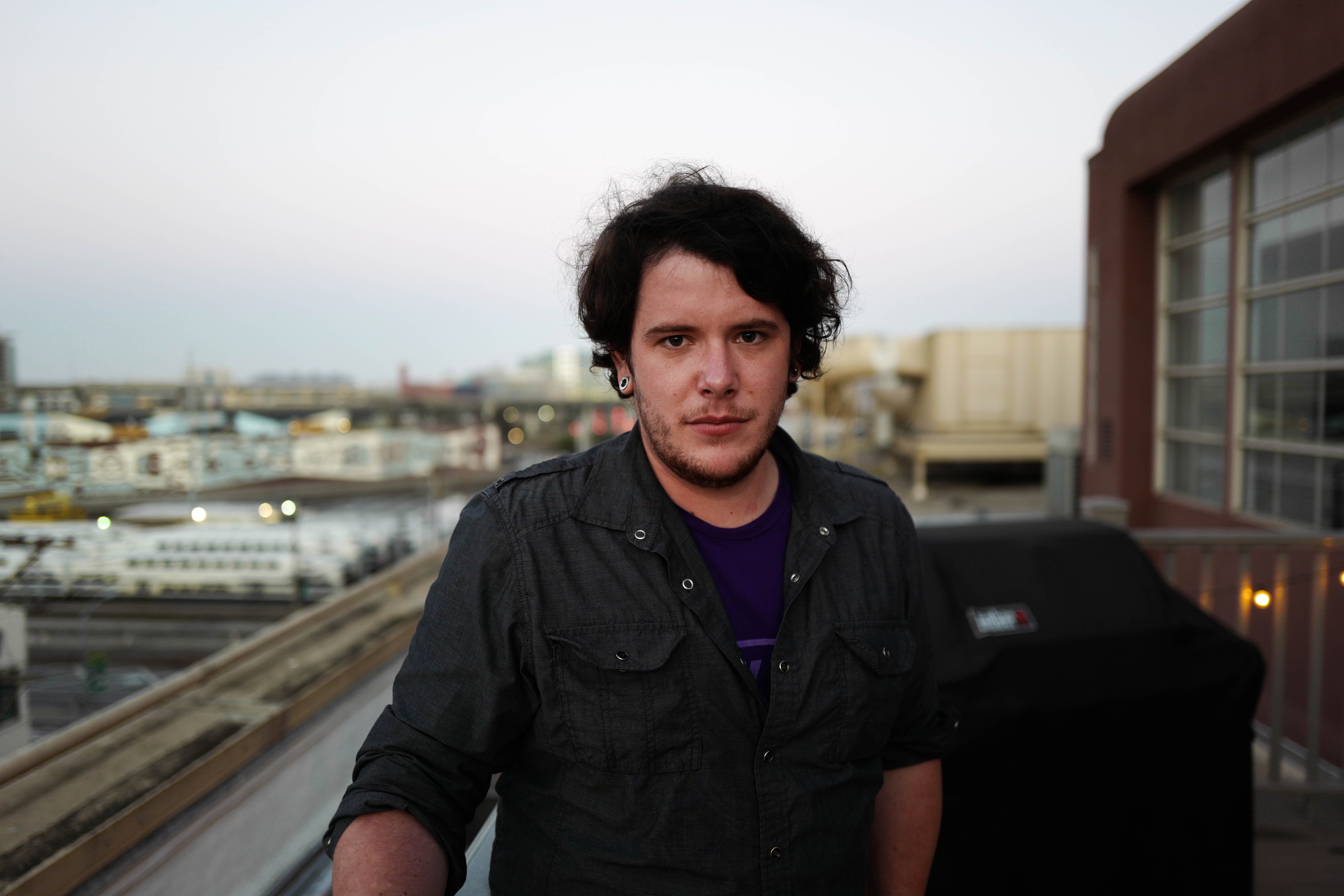 The photograph captures a young man standing resolutely on a rooftop, framed against a soft dusk sky. The cool tones of twilight contrast with his deep expression, evoking a sense of introspection. The urban backdrop, with hints of city lights beginning to sparkle, adds depth to the mood, creating a contemplative yet vibrant atmosphere.