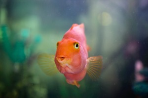 A vibrant pink fish swims gracefully, its expressive eyes conveying a sense of curiosity. The soft, diffused lighting creates a dreamy ambiance, while the blurred underwater background adds depth and enhances the fish's lively colors. This intimate glimpse into aquatic life evokes a feeling of wonder and tranquility.
