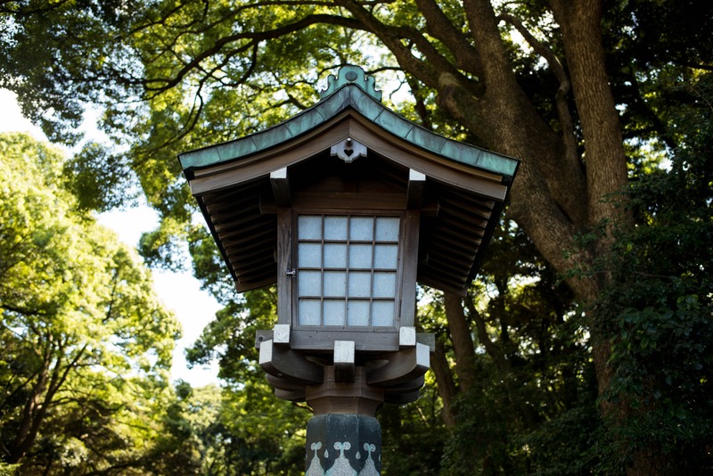 A serene lantern stands proudly against a lush green backdrop, evoking a sense of tranquility and timelessness. The interplay of light and shadow enhances the intricate details of the lantern's wooden structure, inviting contemplation. The bright, dappled sunlight filters through the surrounding trees, creating a harmonious connection between nature and craftsmanship.