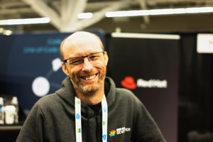 In a bustling expo setting, the photograph captures a man smiling warmly, embodying a sense of camaraderie and enthusiasm. Soft, natural lighting accentuates his cheerful demeanor, while the blurred background hints at an engaging event atmosphere. The composition invites viewers to share in this moment of connection and positivity.