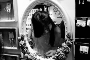 In this black-and-white photograph, a young woman leans intently over a mirror adorned with delicate roses, examining her accessories. The soft play of light casts gentle shadows, enhancing the intimate and contemplative mood of the scene. Surrounding her, the subtle outlines of jewelry glimmer quietly, adding depth and a hint of glamour to the composition.