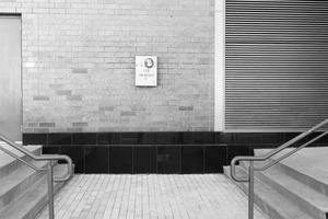 The photograph captures a stark, minimalist entrance marked by a sign displaying the address '110 San Antonio St.' The muted tones of the brickwork contrast with the sleek black tiles, creating a somber yet serene atmosphere. Soft lighting emphasizes the textured surfaces and outlines the stylish yet uninviting stairway leading into the space.