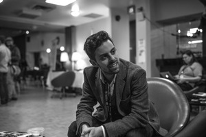 In a softly lit lounge, a man sits casually in a cozy chair, exuding a relaxed yet engaged demeanor. His thoughtful expression and gentle smile hint at a moment of connection amidst the subtle hum of conversation and activity in the background. The monochromatic palette enhances the intimate atmosphere, drawing focus to his contemplative presence.