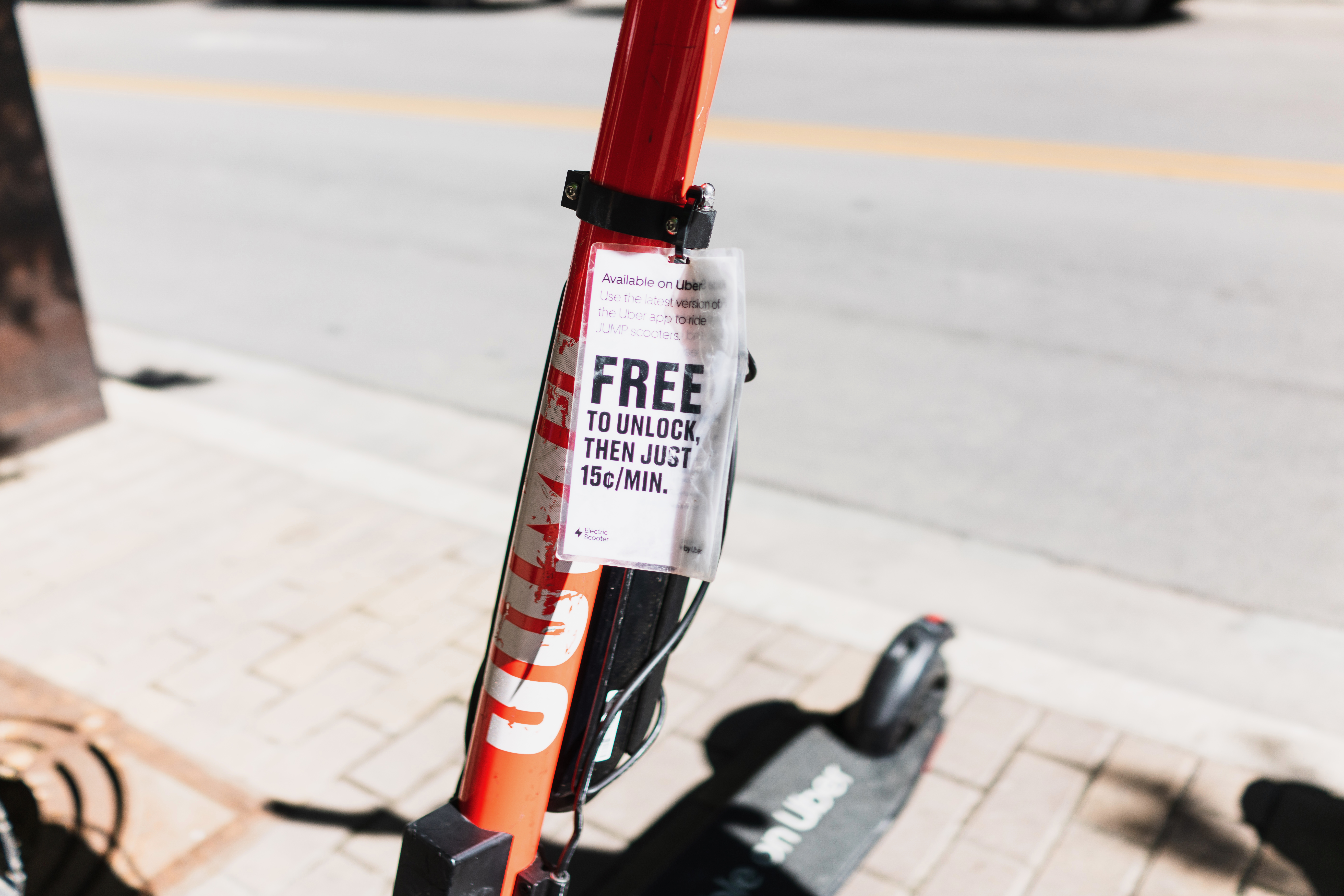 The photograph captures a close-up of a brightly colored e-scooter, prominently displaying a sign advertising its rental terms. The bright sunlight casts sharp shadows, creating a vibrant yet casual urban feel, as pedestrians and traffic softly blur in the background. This composition emphasizes the accessibility of modern transportation amidst the everyday hustle of the city.