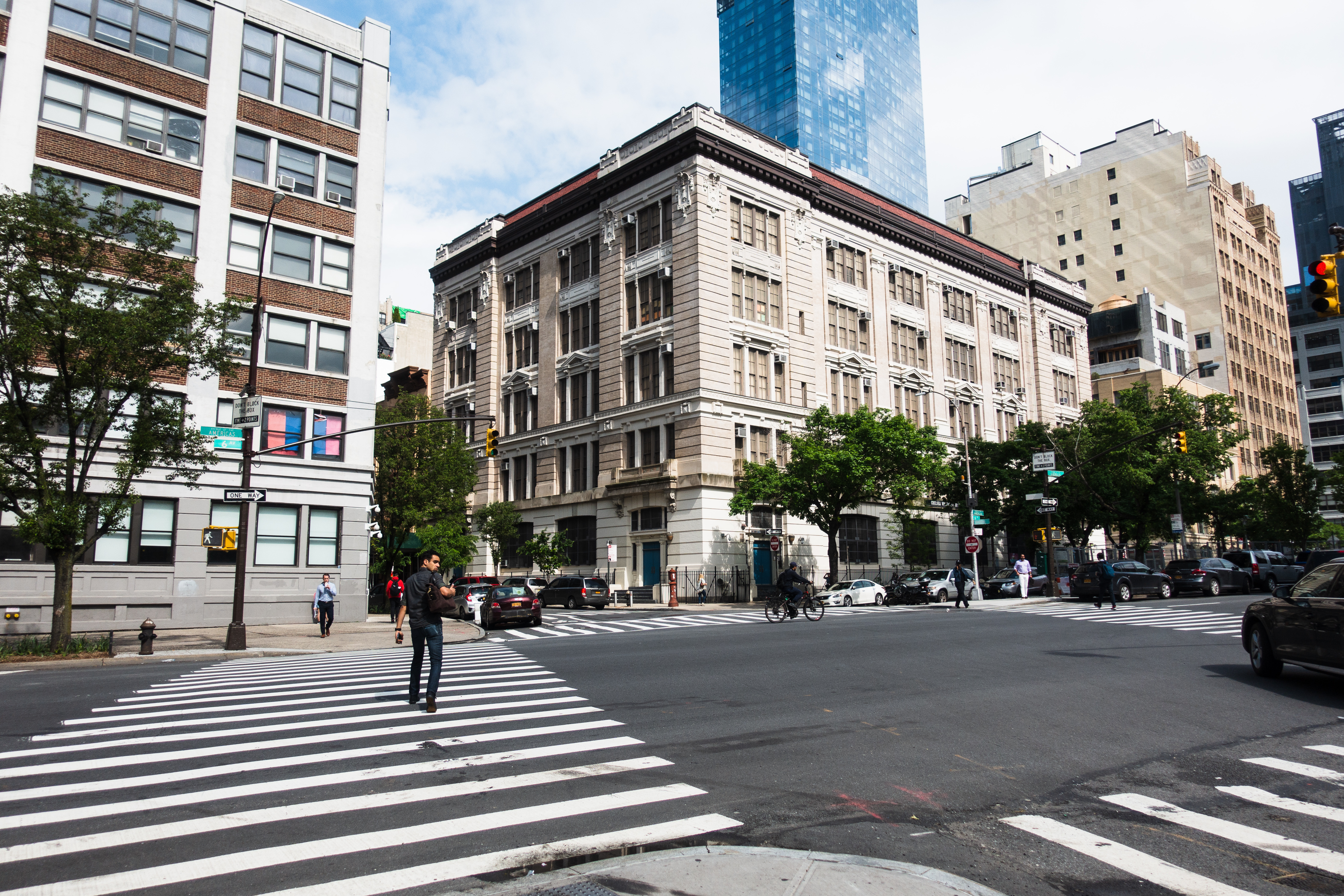 The photograph captures a bustling city intersection, where a blend of architectural styles harmoniously coexists. Sunlight bathes the historical building on the corner, enhancing its ornate details, while the nearby contemporary skyscrapers rise sharply against a partly cloudy sky, emphasizing the vibrant urban atmosphere. Pedestrians and vehicles animate the scene, embodying the dynamic energy of city life.