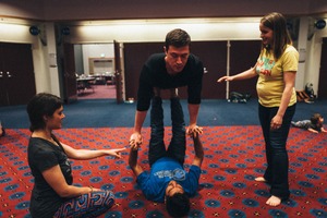 In a dynamic scene filled with collaboration, a group of four individuals engages in a unique balancing act on a vibrant, patterned carpet. The room's ambient lighting casts a warm glow, enhancing the camaraderie and focused expressions as they support one another. This moment captures both playfulness and teamwork in an atmosphere of encouragement and trust.