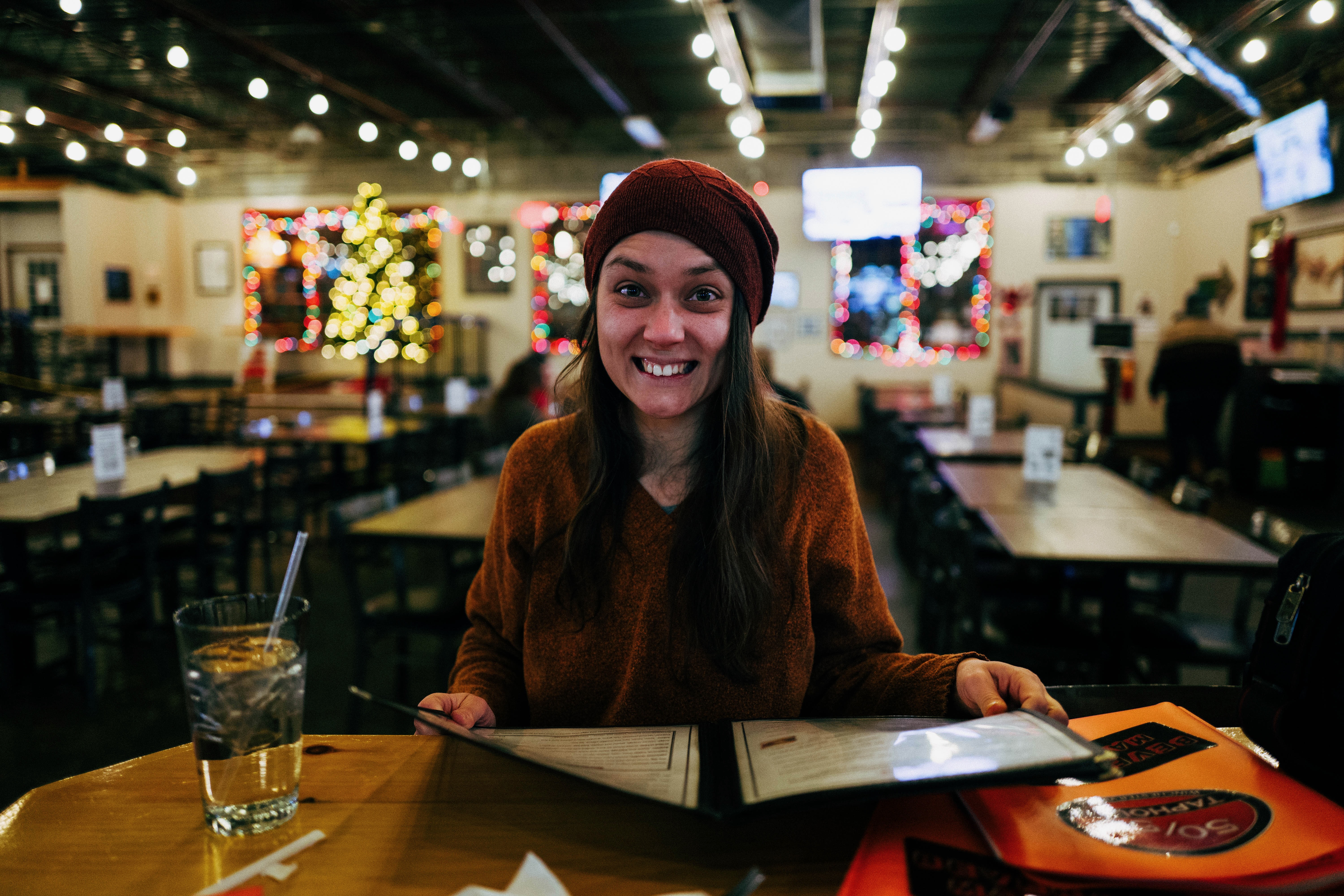 In a warmly lit restaurant, a young woman beams with excitement as she scans the menu, her red hat adding a playful touch to her cozy ensemble. Behind her, festive lights twinkle, creating a cheerful atmosphere that enhances her joyful expression. The composition captures a moment of delightful anticipation, inviting viewers into a lively dining experience.