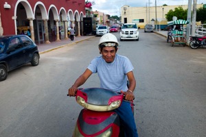A young man rides his scooter down a quiet street, exuding confidence and joy with a broad smile. The warm daylight enhances the vivid colors of his scooter, while the architecture hints at a vibrant cultural backdrop. The scene captures a moment of freedom and the spirited atmosphere of urban life.