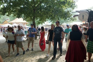 The photograph captures a bustling outdoor festival, where vibrant costumes and casual summer attire blend seamlessly. Soft, dappled sunlight filters through the lush tree canopy, creating a warm and inviting atmosphere, while people meander among colorful booths and enjoy their surroundings. The diverse crowd exudes a sense of joy and community, embodying the spirit of celebration.