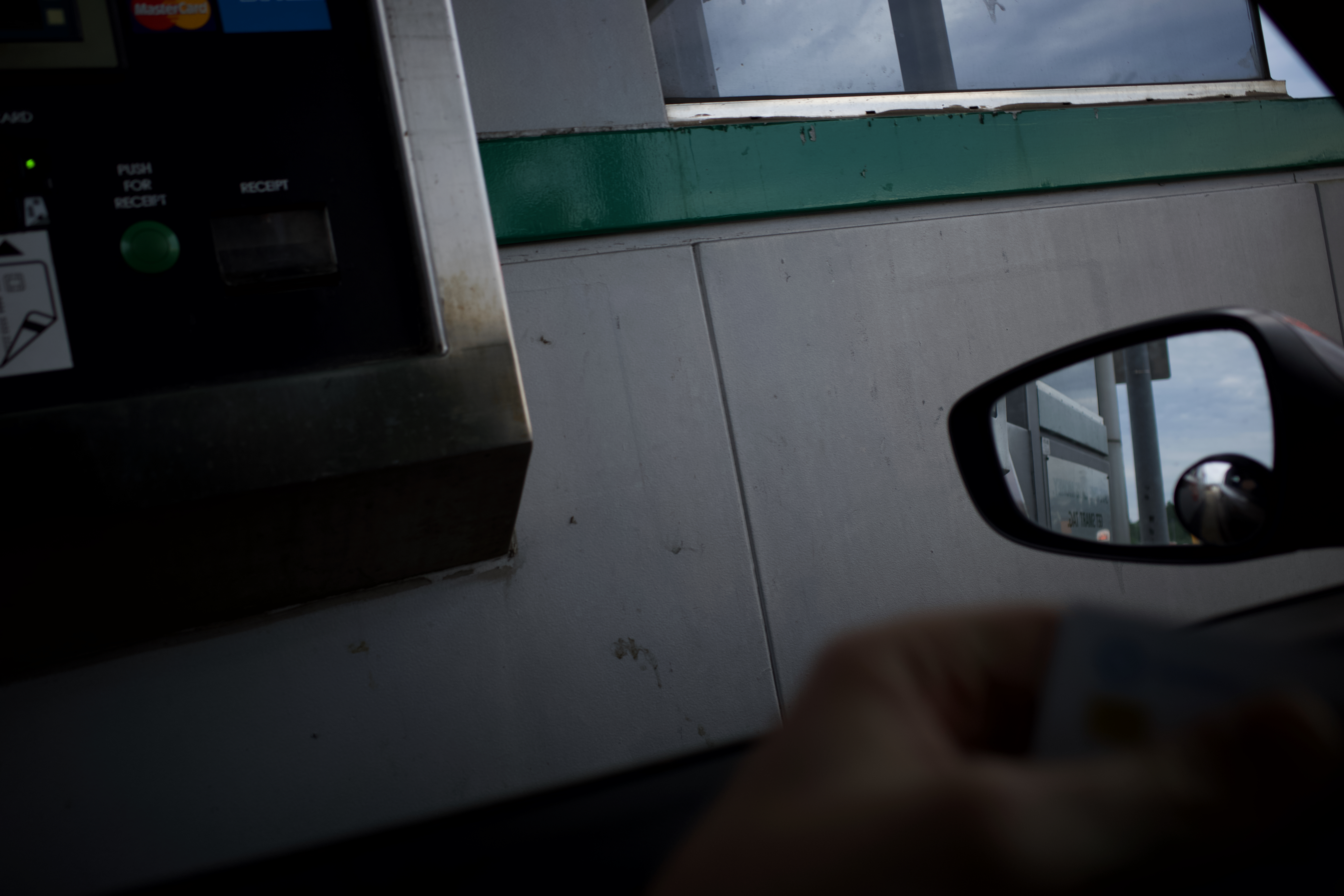 The photograph captures a moment at a toll booth, highlighting the interaction between driver and machine. The focus on the hand reaching for payment contrasts with the stark, industrial backdrop of the booth, evoking a sense of solitude and routine. Soft, muted lighting and clouded skies add to the mood, reflecting the often overlooked transitions in daily travel.