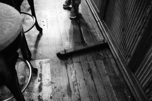 In a dimly lit space, the photograph captures the act of sweeping a wooden floor, focusing on the subtle details of the environment. The juxtaposition of the sweeping motion against the worn floorboards suggests a sense of nostalgia and quiet diligence. Shadows play dramatically across the scene, enhancing the mood of industrious solitude.