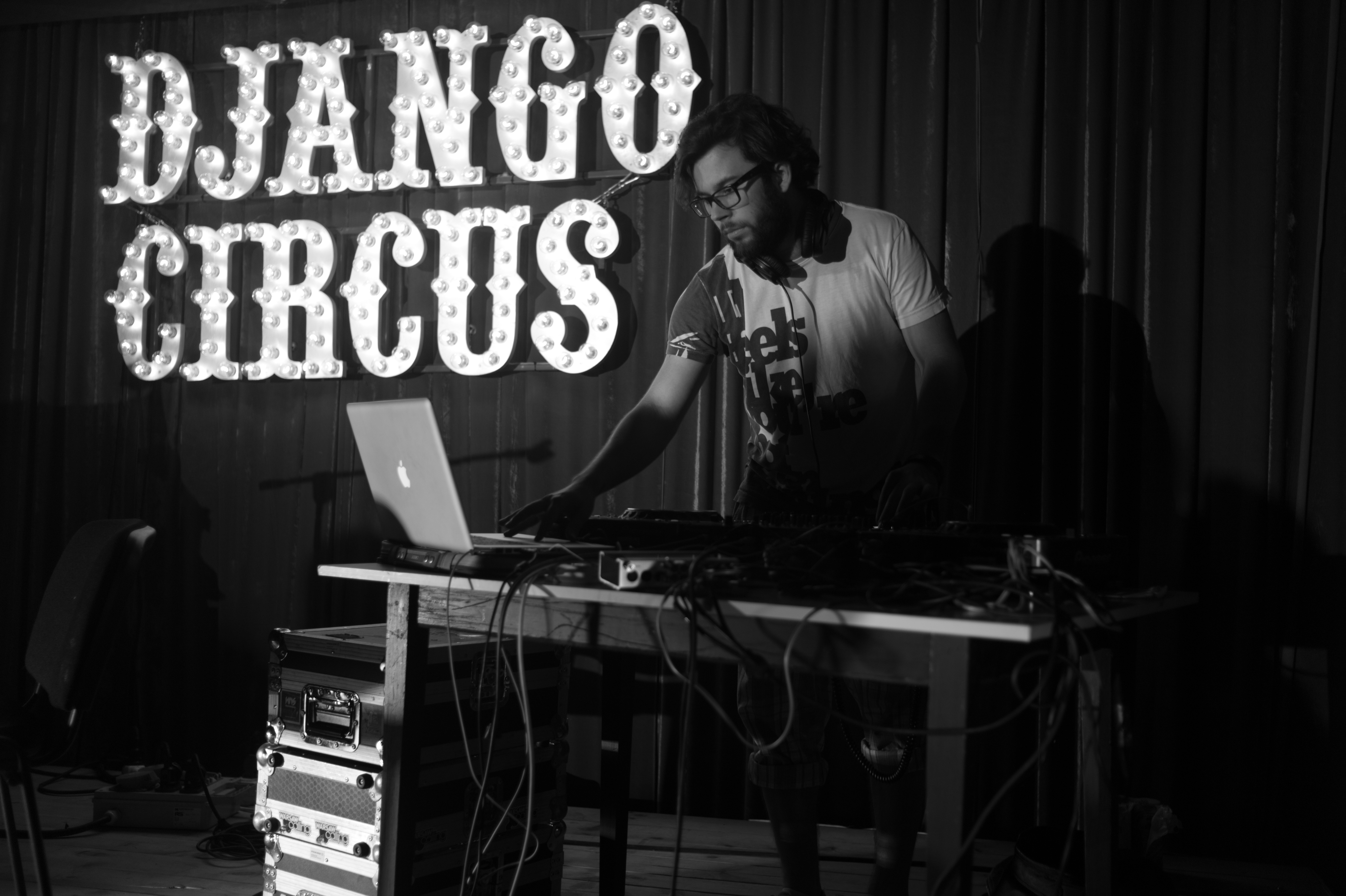 In a dimly lit venue, a DJ immerses himself in his craft, surrounded by tangled cables and equipment. The stark contrast of light and shadow highlights his focused expression against a backdrop of illuminated letters spelling 'DJANGO CIRCUS.' The monochrome palette adds a nostalgic mood, capturing the intensity of live music performance.